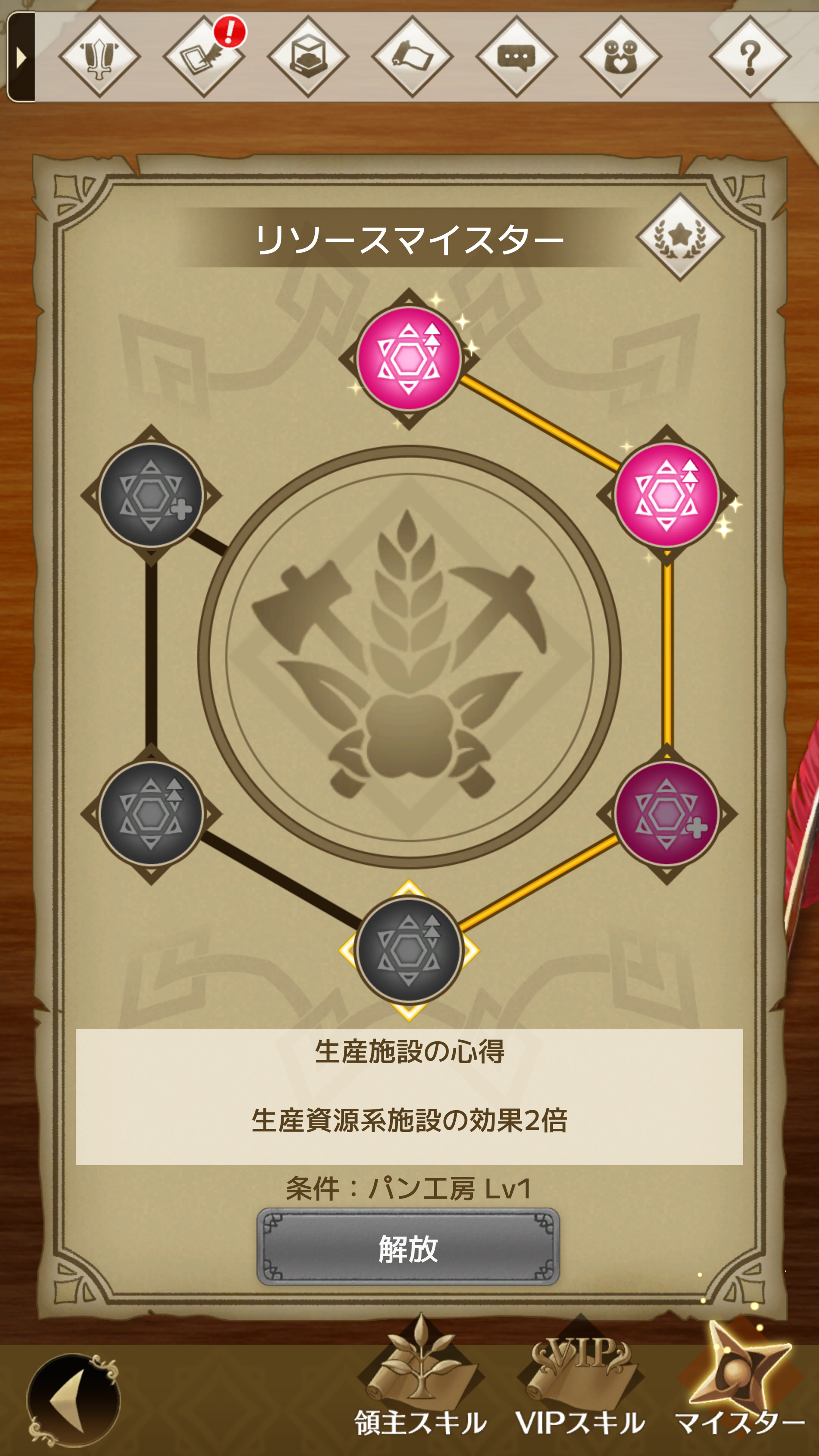 | 生産の心得Lv2 | 各資源が Lv15を達成 | 各資源の生産率上昇 |