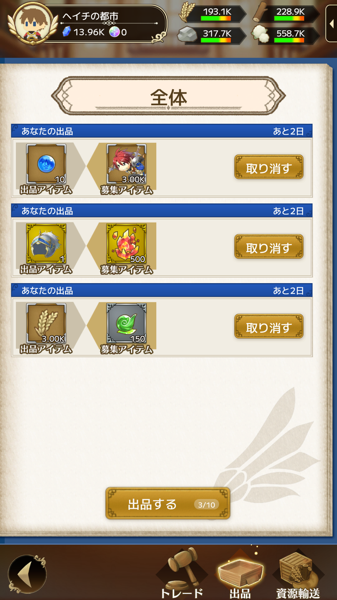 資源、兵士、エレメント、装備を「騎士団内」や「匿名の全体のユーザー」と取引できます。