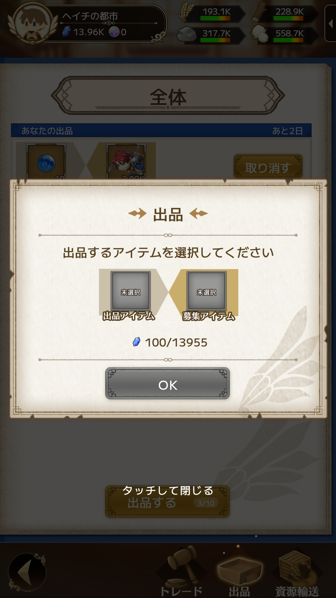 出品アイテムと募集アイテムを選択し、ジェムを消費することでトレードへ出品が可能です。