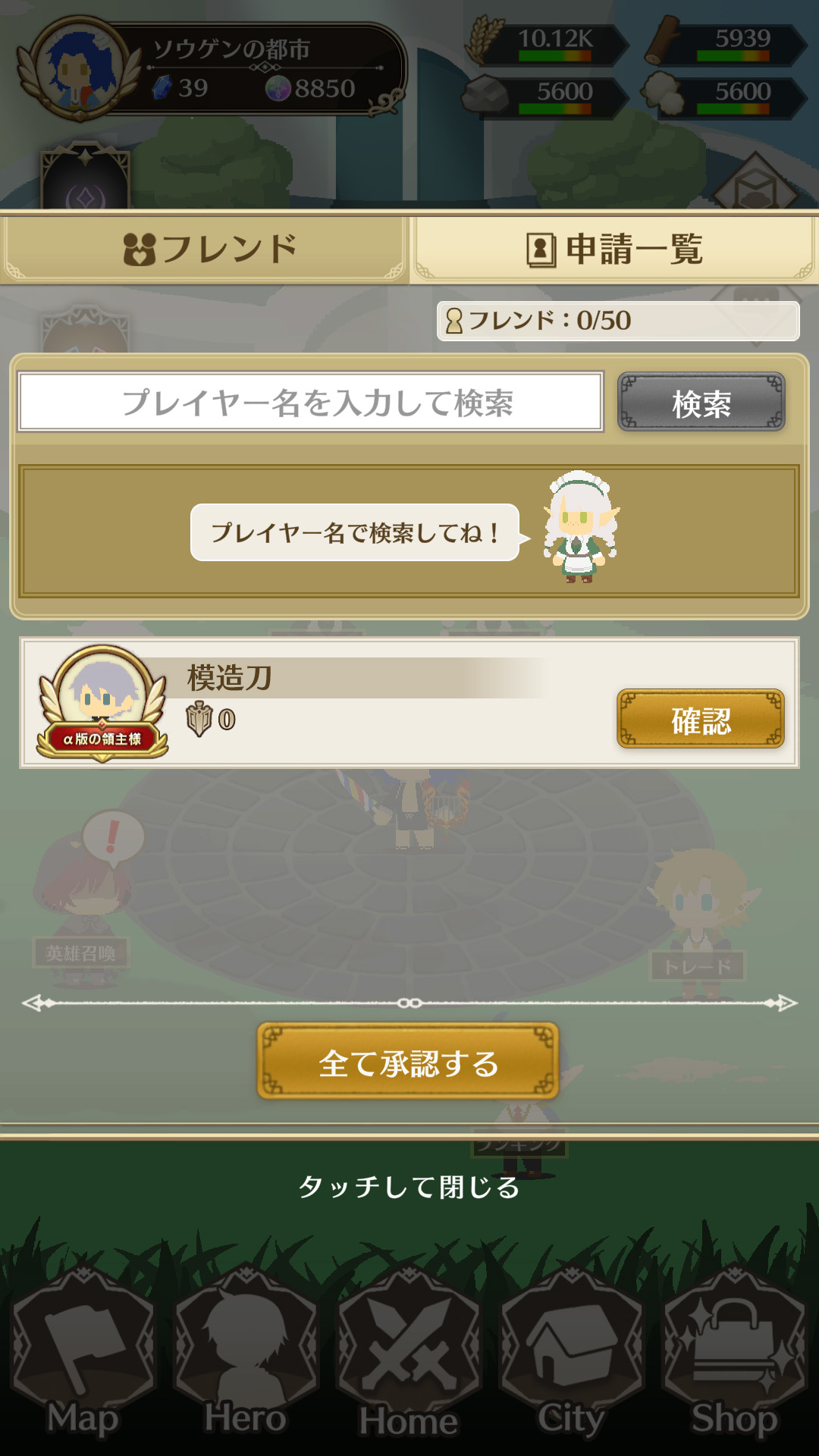 【申請一覧】 ユーザーを検索してフレンド申請したり、送られてきたフレンド申請を承認拒否することができます。