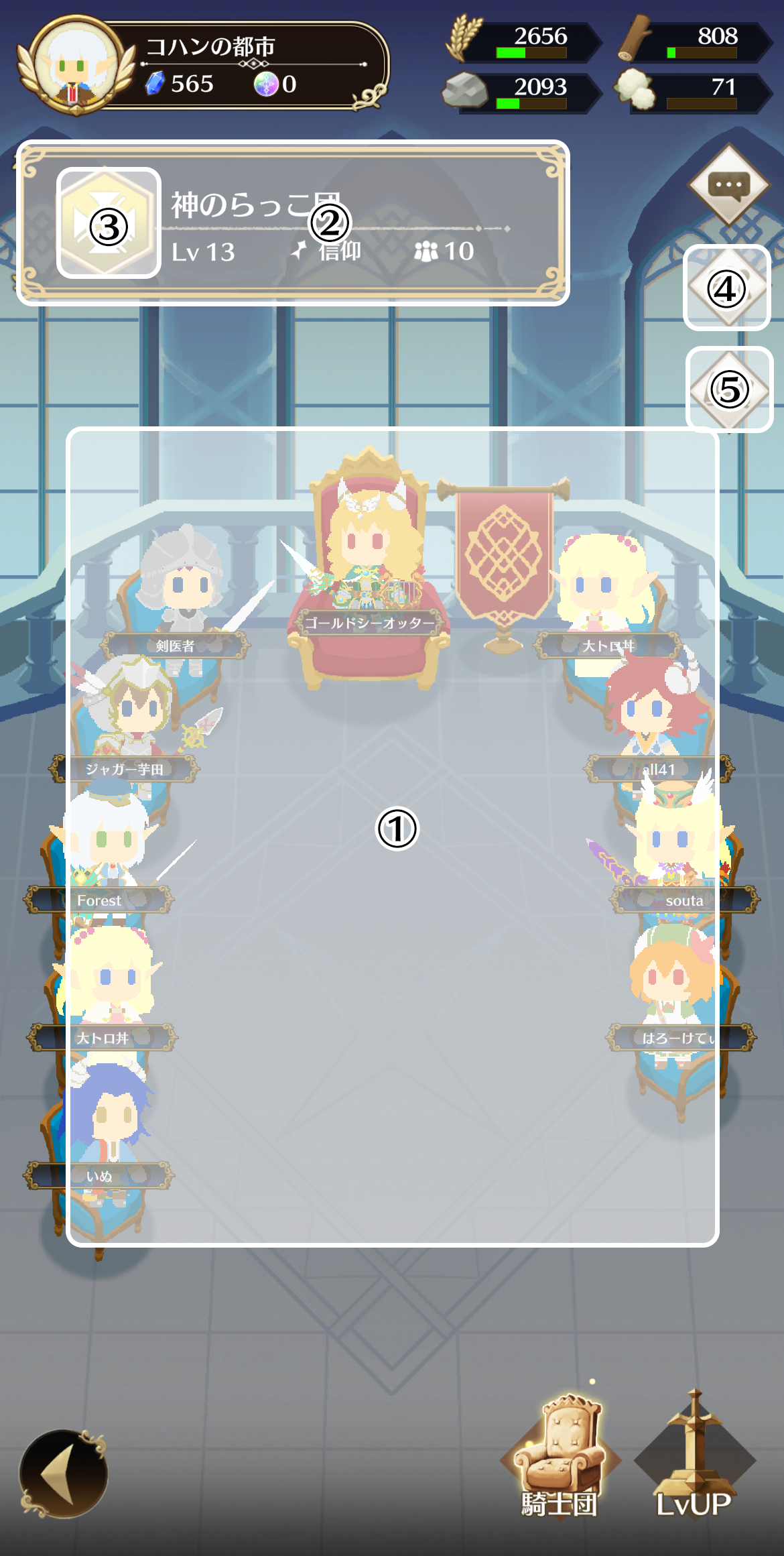 ②騎士団のエンブレム、騎士団名、騎士団レベル、騎士団方針、所属人数を確認できます