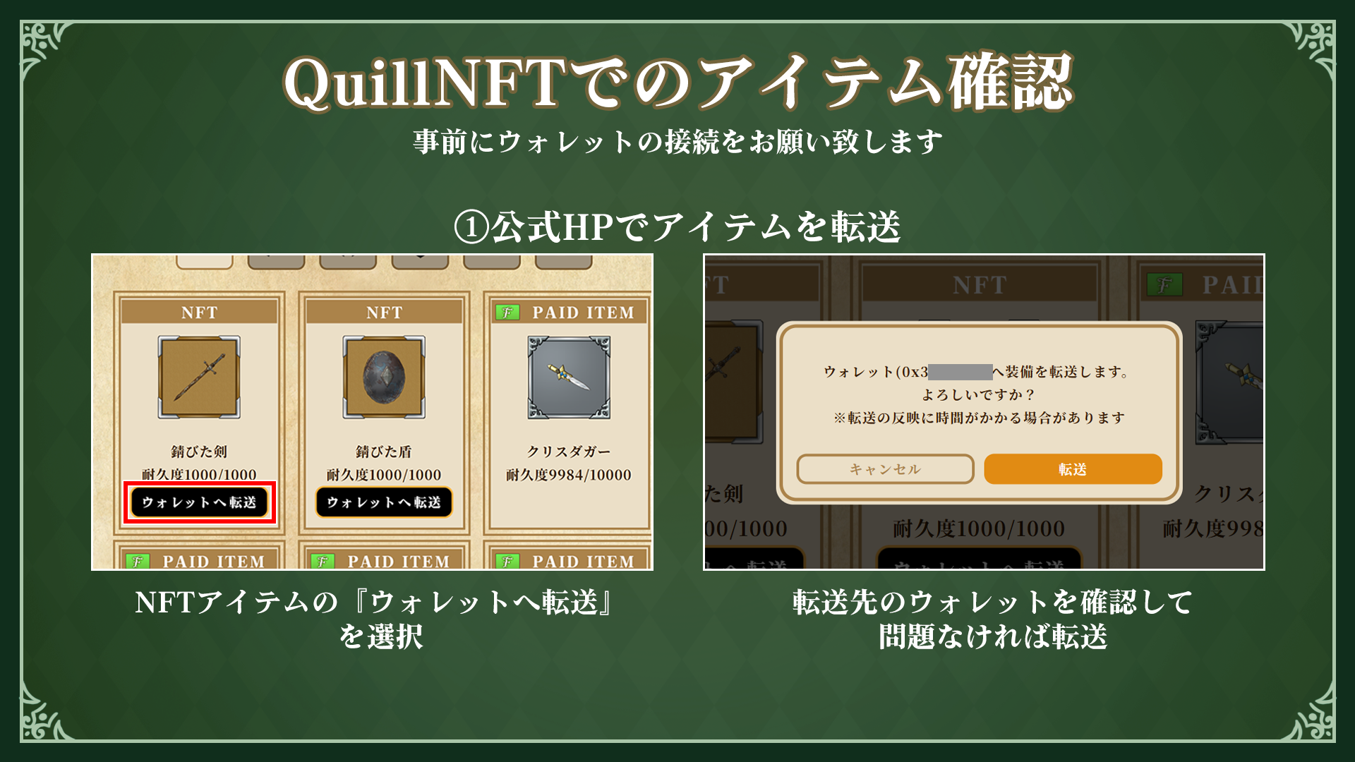 ・僕サガ公式HPの「ITEMLIST」からNFTアイテムを選び、『ウォレットへ転送』を選択