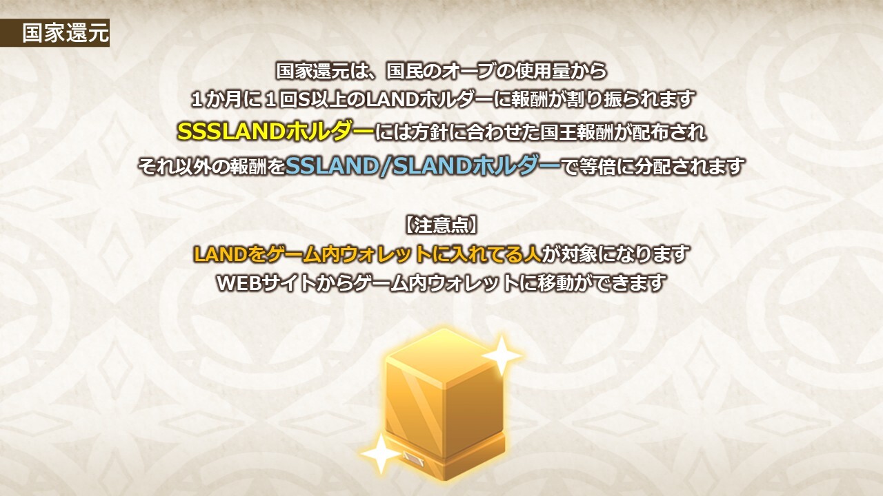 帝国制(国王:60%、大臣:30%、SSLAND、SLANDホルダー:10%)