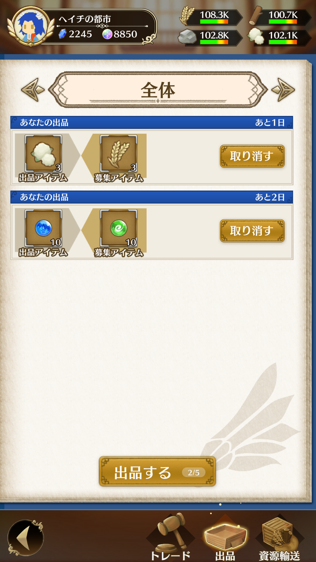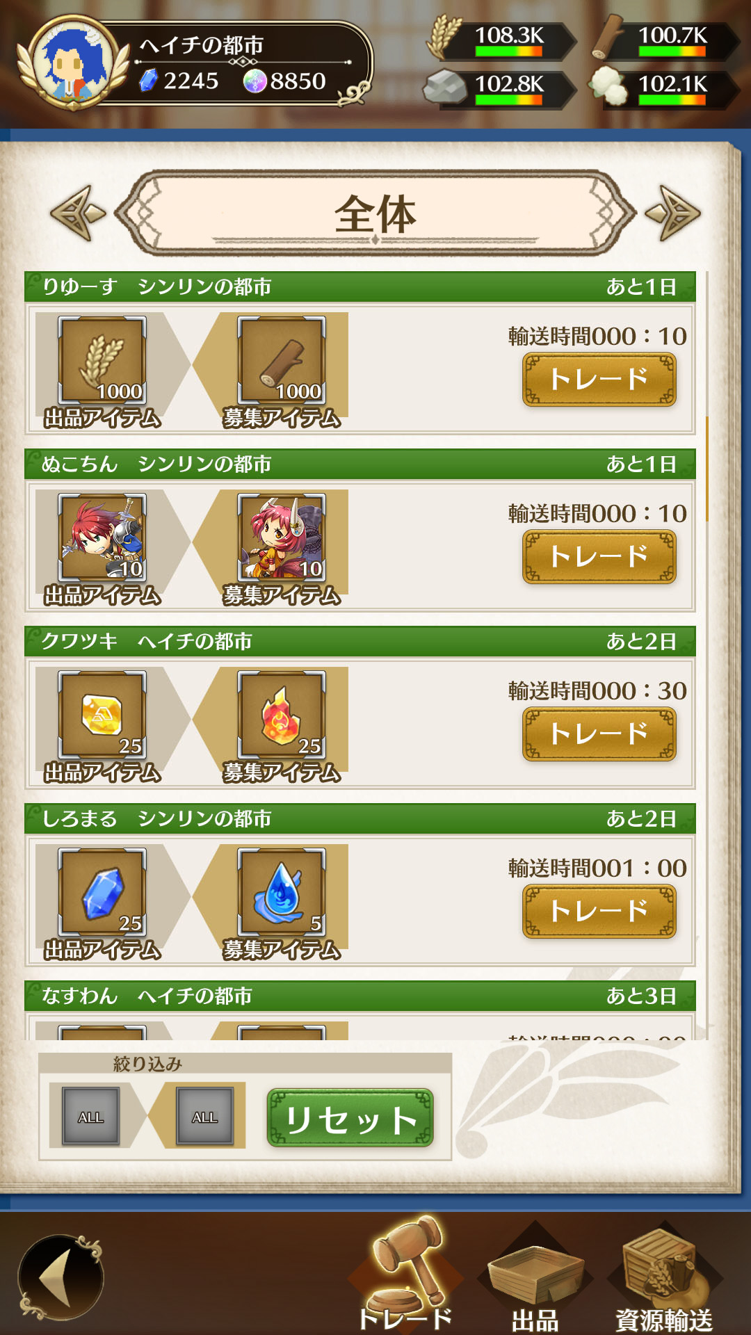 他のユーザーとアイテムをトレードしたり、自分の所有する領地や他のユーザーの領地に資源を輸送できる機能です。