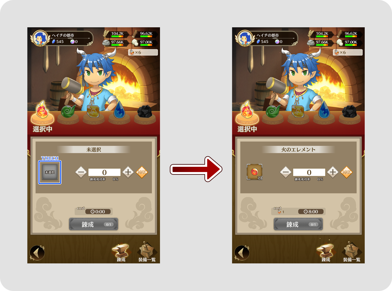 The rarity and number of elements affect the resulting equipment and the success rate of the refinement.