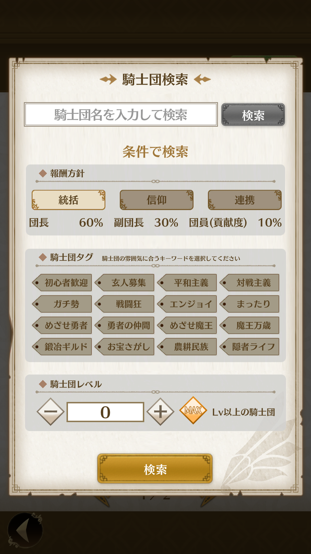 You can search for Knights' Orders that match the atmosphere you want to join by selecting the Order's name, mission statement, tags, and Order Level.
