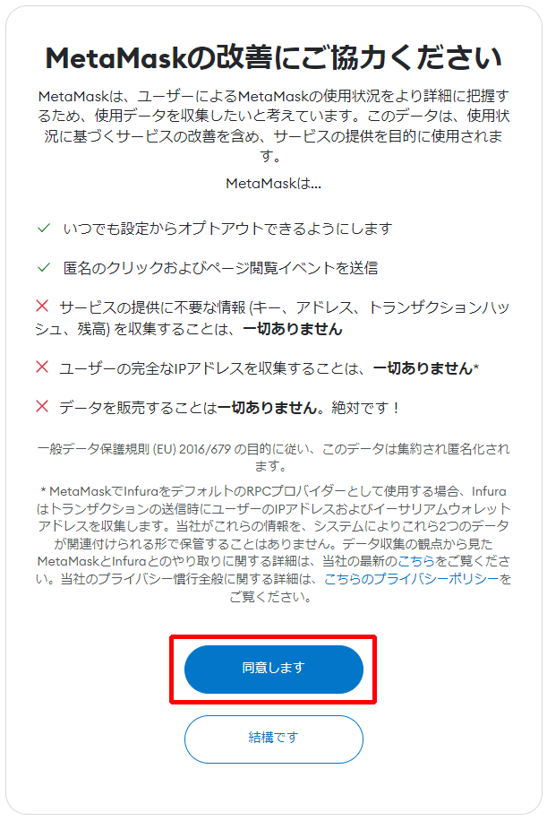 A message will appear saying "Help us improve MetaMask." Read the message and click