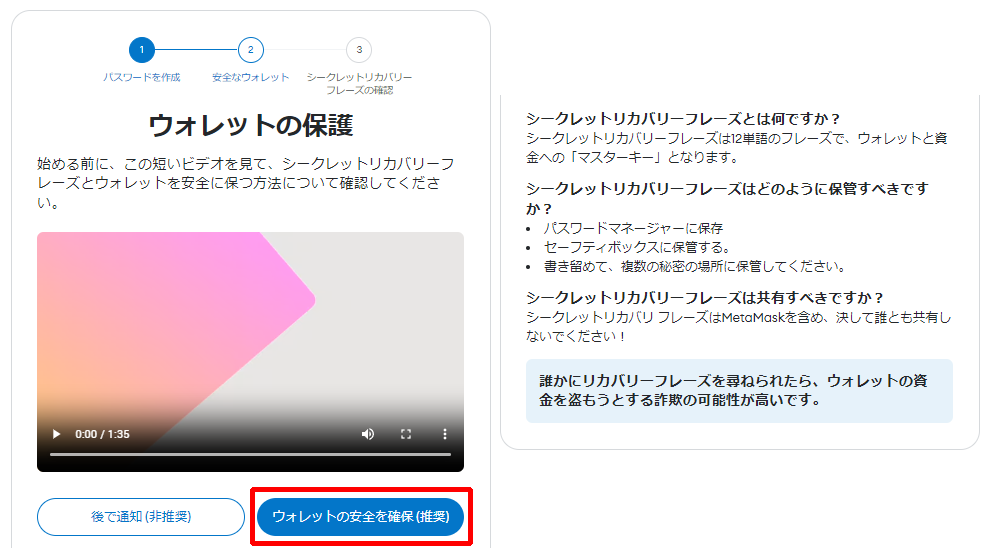 Read the video and explanation carefully and click Secure your wallet (recommended).